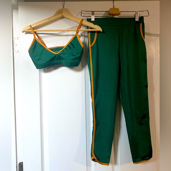 Never worn. Two piece matching set from Poprageous. 70s inspired festival or work out set. Size S. Stretchy Material. Emerald Green with copper trim.The pants are a cropped length. Smoke free home.