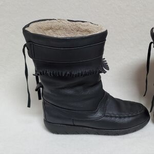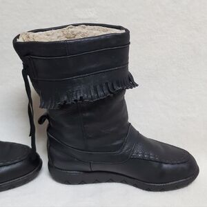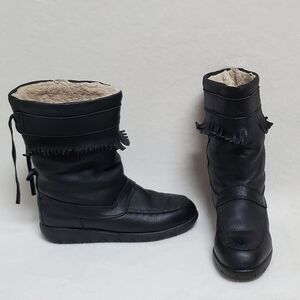 70s Vintage Black Leather Bold Fringe Round Toe Sherpa Lined Mukluk Boots 9