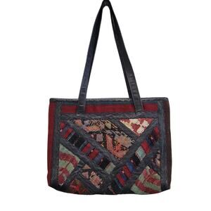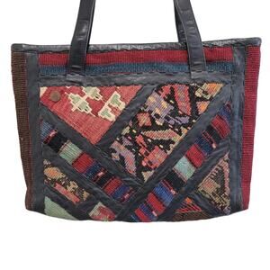 70s Vintage Boho Leather and Wool Carpet Bag Tote