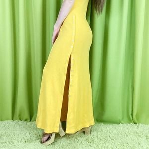 70s Vintage Bright Yellow Rib Knit Side Slit Button Up Maxi Dress