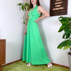70s Vintage Kelly Green Faux Pearl Detailed Maxi Gown