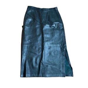 70s Vintage Leathercare Process Black Leather Midi Skirt Medium