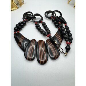 70s Vintage Mod Laminated Plastic Horn Lucite Necklace Bold Red & Black Pendant