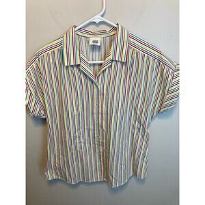 Nikki True 70's Vintage Tagged 13/14, fits like a modern Large Excellent condition! Rainbow Pin Striped Short Sleeve Top Button Up Cuffed Sleeves 50% Polyester 50% Cotton Measures 21" pit to pit 25" length top to bottom tags: 70s, vintage, striped, rainbow, bright, colorful, pride, pinstriped, short sleeve, blouse, button up, unique, retro, summer,