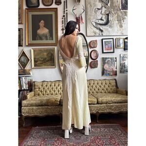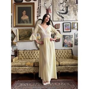 70s Vintage Pastel Yellow Bell Sleeve Pleated Crochet Maxi Dress with Lace Up Back Size M