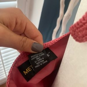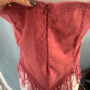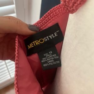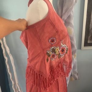 1970's Metrostyle Vintage pink (coral) Halter and tie back top. 100% LEATHER suede. SIZE 12. MATCHES TO SKIRT ON OTHER LISTING! Criss crosses with crochet pattern. Diamond shape embroidery mid shirt. Finished with a lace like embroidery and fringe. Hidden zipper at back. Had to hold on mannequin because of size difference. Previous owner has applied appliqué and creating marks inside and some pulling. Cannot see marks as lining is over it. Small discoloration.