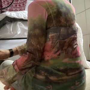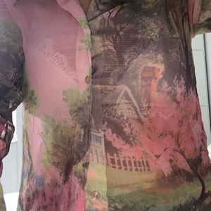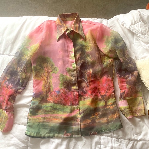 One of a kind from a thrift shop in Greenwich Village thrift store in 1992. I was told this shirt was from 1970. !00% Polyester. See through but not so much as you can go out with it.