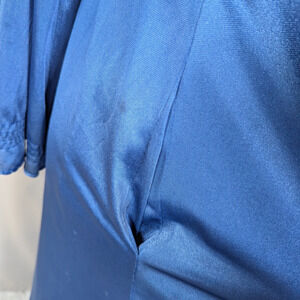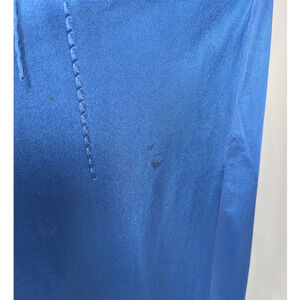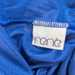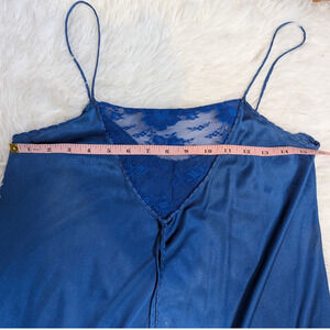 Stunning vintage René nightgown and robe set in a deep sapphire blue satin. Features a full-length slip dress with lace bust detail, adjustable straps, and braided waist tie. The matching long robe includes sheer lace shoulders and a flowing silhouette for an elegant, Old Hollywood vibe.