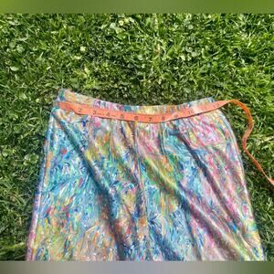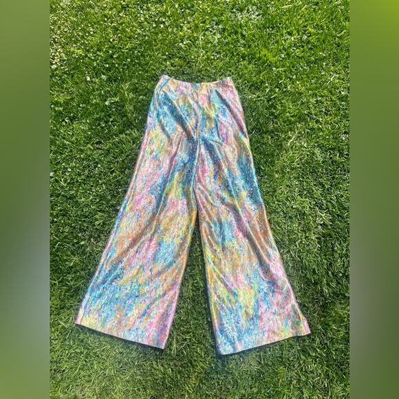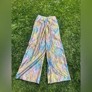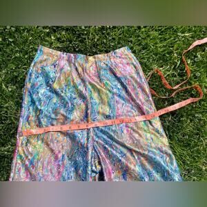 This is a gorgeous pair of 1970s vintage high waisted wide leg pants. Made of a printed shimmery nylon fabric in a watercolor / oil slick rainbow pattern in pinks, greens, blues, yellows whites and oranges. The pants have a blue talon zipper at the back. Have no size tag - likely handmade. Measurements in line with a xs. In good vintage condition with no major flaws to note.
