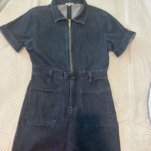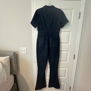 The most comfortable denim jumpsuit. It’s stretchy in the right places and holds you in other places. Slight wear at the bottom of each pant leg heel.