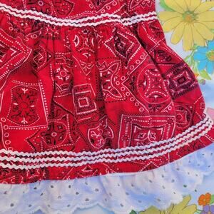 70s kids Red bandana print skirt with white lace trim x 8-10" w flat x 14" L