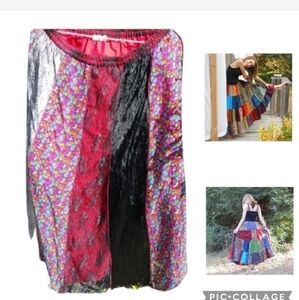 From the guy I bought all my dresses from. It does not have tags but it is brand new purchased today. This is wild and fun! The skirt has a red acetate underlay with all the different patterns that you see.The waist measures 15 inches across without being stretched. so this will accommodate perhaps an extra large as well. the skirt is ankle length on me and I am 5 foot 6. It hits me above the ankle. love this one.