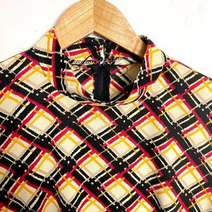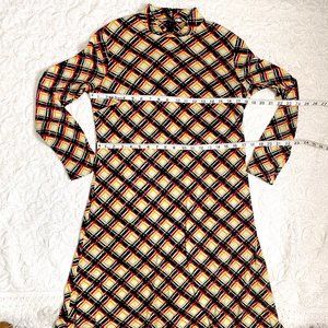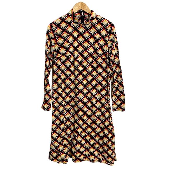 Vintage 1970s plaid A-line dress by Nancy Valentine. Mock turtleneck two hook and eyes at the back. Long sleeves. Back zipper. Two front darts. Nubs at waist on the seams, meaning there was probably originally a belt. Dress is clingy and needs a slip to make her happy. Hem is hand sewn. Plaid is buttery beige striped with red, black, yellow and tan.