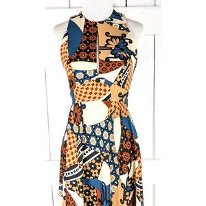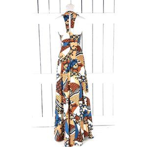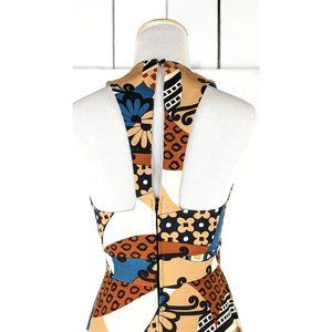 70s vintage brown floral psychedelic print sleeveless peep halter top maxi dress