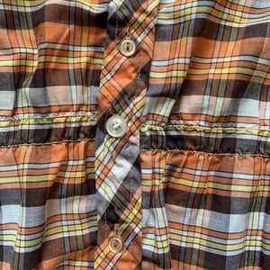 Super cute vintage 70s plaid sleeveless shirt! Rounded collar, cute little pockets, elastic at waist. One button at waist has been replaced, 3rd photo. Marked 11-12, Fits like medium, measurements laying flat: Pit to pit and shoulders: 19” Waist: 16” to 18” elastic Length: 22.5”