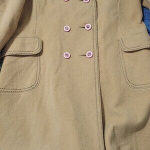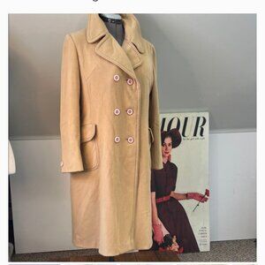 Camel color, no flaws on the outside, someone has sewed up the lining and the armpits have some issues in the lining. Coat needs a good dry cleaning but it's otherwise super cute and warm. It's a union made so im pretty sure it's 100% wool. No size so i added measurements