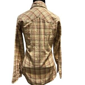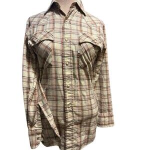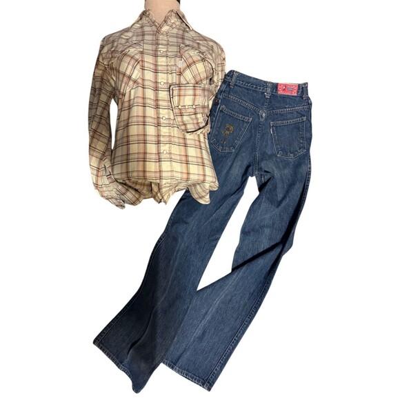 This product is a rare pair of vintage 1970s Levi's bell bottom jeans with a high waist and a big E talon back pocket. The jeans feature a rare white tab, adding to their retro appeal. Made from denim, these tall size jeans have a 34-inch inseam and embody a Western look that is synonymous with the era. Perfect for women looking to add a unique and timeless piece to their wardrobe. The jeans come with a white label 1970s big E western Levis pearl button snap flannel shirt for the perfect western look for a complete outfit.