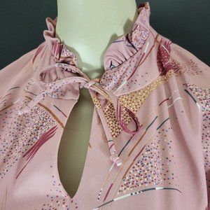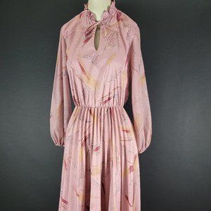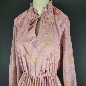 70s/80s Abstract Long Sleeve Ruffle Tie Neck Dress
