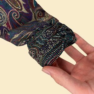 Vintage abstract womens button down blouse, manufactured ca. 1970s-1980s by Nicole Blake Petites. Tunic-style neck with three tight buttons, flap over button closures, and pleating on the wrists. Lightweight fabric with psychedelic dot pattern in teal, purple, green, and beige. Size 6P.