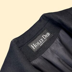 Vintage double breasted womens trench coat, manufactured ca. 1970s-1980s by Holly Deb. Black wool coat with button closures, side pockets, slits on the sides, and a satin lining. Features built-in shoulder pads and gold buttons. Size not listed; see measurements.
