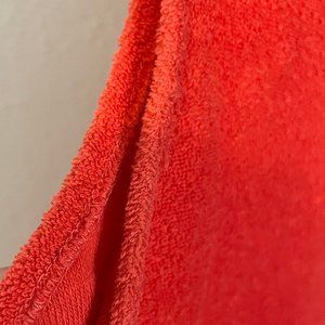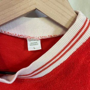 Look like a 70's gym-star in this iconic and bright muscle tank. Bright red-orange with a white striped collar. Single stitched 'sleeves'. 100% cotton, Made in the US. In great shape. Fits like a Women's Medium or a Men's Small.