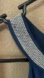 This elegant navy blue halter dress is perfect for any occasion, however does have a few call outs. Gems on neckline, one is off and another is discolored while the backside loop is broken to button. The flowing design and sophisticated color make it a must-have in your wardrobe.