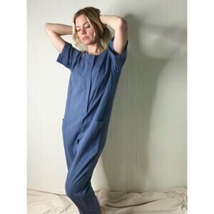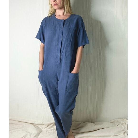 7115 BY SZEKI Mechanic Blue Linen Gauze Short Sleeve Jumpsuit US SMALL