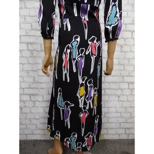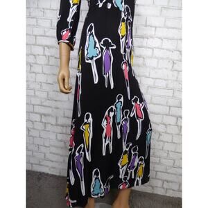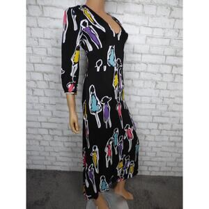 $725 Boutique Moschino Black Multi Print Crepe Midi Vneck Dress 38 US 4 NWT