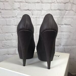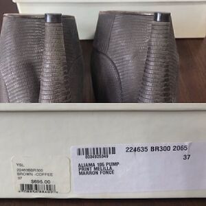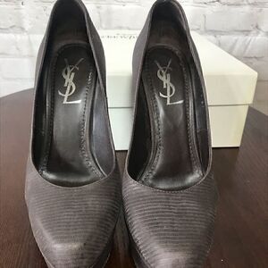 Chocolate textured suede Yves Saint Laurent Aliama 105 pumps with round toes, tonal stitching and covered heels. Includes box