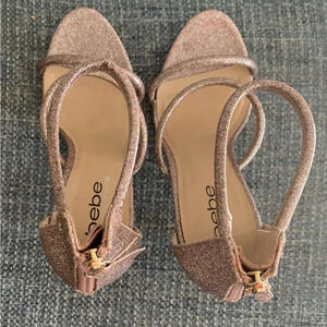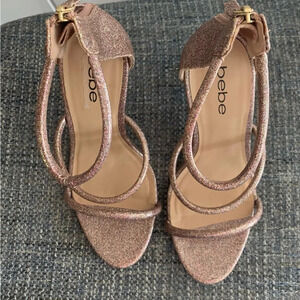 7.5 Bebe Berdine Womens Strappy Textured Dress Sandals, Pink Glitter Heels. Preowned great condition. Worn only for Prom.