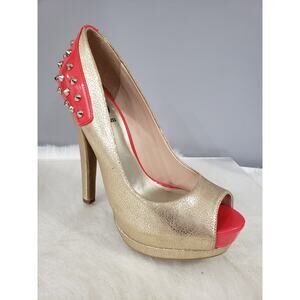 Stunning pair of gold studded platform high heels - brand is G by Guess - size is 7.5. Shoes are in very gently used condition with plenty of life left.