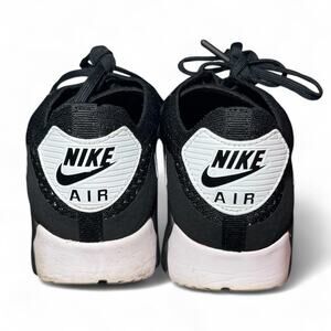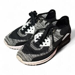 Nike Air Max 90 Ultra 2.0 Flyknit sneakers, good used condition, lightweight Flyknit upper. Flaws: midsole discoloration and scuffs, light outsole wear, small shop mark on sole; cleaned. Breathable knit with cushioned foam midsole and visible Air for comfort. Oreo black/white pattern with molded eyelets; Ultra 2.0 tooling keeps them light. Easy everyday with jeans, joggers, or leggings. Measurements: tag 7.5 US / 5 UK / 38.5 EU / 24.5 cm; insole length ~9.75 in (deriv). Tags: nike air max 90, flyknit, ultra 2.0, oreo, black white, sneakers, streetwear, athleisure, casual, comfort, womens 7.5, size 7.5. Packed with recycled materials. Ships Mon–Sat in recycled packaging, includes Smarties + handwritten thank-you. • xxXddp-c1