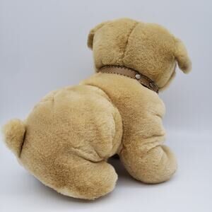 Realistic black puppy dog eyes stealing your heart begging to be squished and loved! Fitted brown leather collar, short relaxed ears. shiny black nose, Golden Brown Soft fur with short and stubby paws standing him up approximately 7.5 inches tall and 7.5 inches wide.