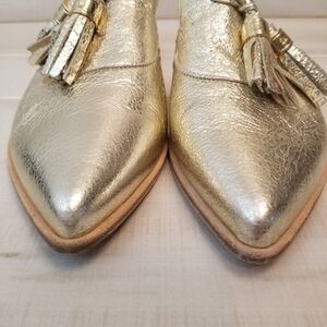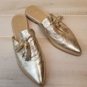 {7.5} Stuart Weitzman Metallic Gold Slide Along Tassel Mules