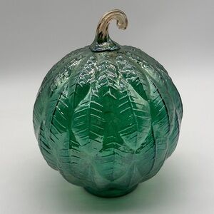 This is a new 7.5" wide iridescent art glass blue leaf textured pumpkin figurine with LED lights. It is in the shape of a pumpkin, featuring a vibrant aqua blue color. The pumpkin is designed with a leaf textured pattern, making it perfect for fall, autumn, Halloween, and Thanksgiving decor. Made of glass, this pumpkin figurine is 7" high and emits a soft glowing light.