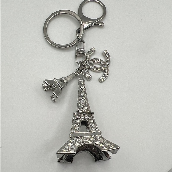 758. Elegant silver keychain with CC charm featuring a sparkling Eiffel Tower design. Perfect for adding a touch of Parisian charm to your accessories.