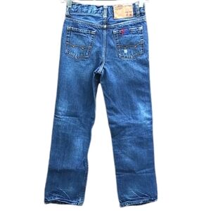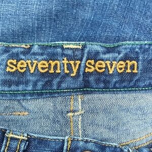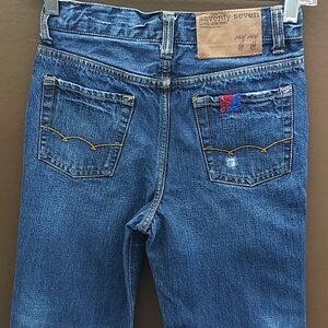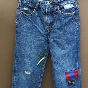 77 Kids Straight Destroyed Jeans with adjustable bands at the waist and patches, zipper and button closure.