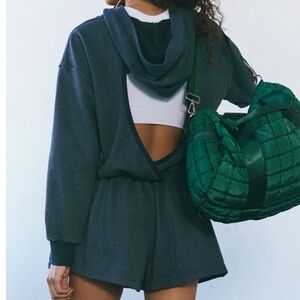 Your new go-to for to-from, this comfy romper is featured in a hooded, long-sleeve style with relaxed shorts and an unexpected open back for the perfect peek of skin. Relaxed, mini length, Comfy cotton blend, attached hood, long cuffed sleeves, elasticated waist, relaxed shorts, open back. Throw on over your favorite sports bra and bike shorts for an effortlessly cool studio-to-street moment.