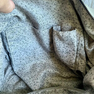 Cesca Beige Ribbed Bucket Handbag, multiple pockets, shell made from synthetic leather, lined w/ floral print polyester which has one spot.