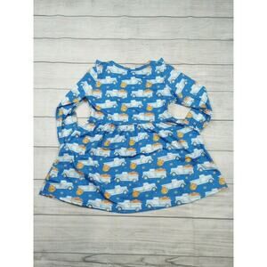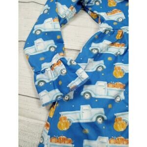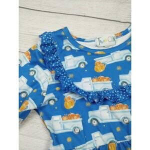 VGUC Two Can long sleeve dress. Blue with blue truck and pumpkin print. Polka dot ruffle on the bodice. Light wash wear
