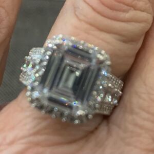 Absolutely gorgeous ring , a white diamond simulant 7.83ctw emerald and round, rhodium over sterling silver ring. Measures approximately 0.88"L x 0.56"W and is not sizeable..