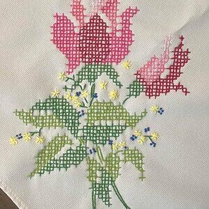 78x57 Vintage Hand Embroidered Cross Stitch Tablecloth + 8 Napkins Floral EUC perfect for Spring and Summer. Intricately detailed pattern. Soooo pretty and feminine and springy!