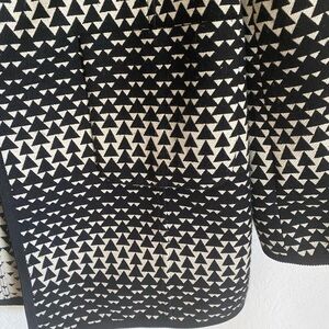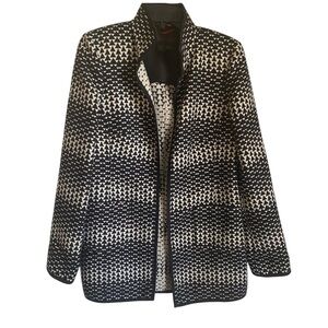 Elevate your style with this chic black and white patterned open front jacket. Perfect for any occasion, this jacket offers a sophisticated look with its elegant design.