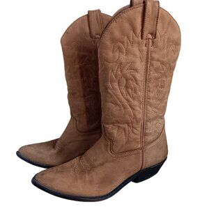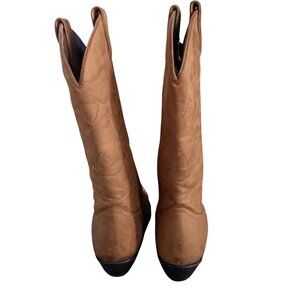 These timeworn leather boots whisper stories of dusty trails and open plains, their soft tan leather softened by years of wear and adventures. Intricate Western-style stitching adorns the shaft, creating elegant leaf and swirl patterns that catch the light and hint at the craftsmanship behind these classic cowboy boots.