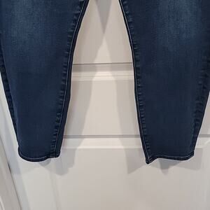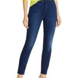 Super high rise jeans in an ankle slim fit. Approximately 13.5 rise, dark blue with light whiskering. Approximately 27 inch inseam.