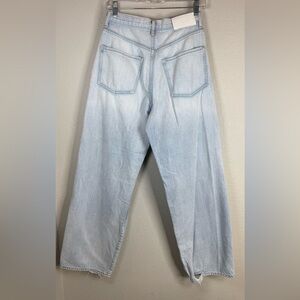 Consider this fit a 90s flashback made modern. These jeans are all attitude, with a pinched high waist, baggy legs, exaggerated pockets, and a subtly tapered hem. Crafted from rigid denim in a light blue wash, the luxe embroidered details juxtapose nicely with the heavy fading, distressed front pockets, and grinding at the hem. Elevate your look with a sleek blazer or pair with a tee for a cool, casual vibe.