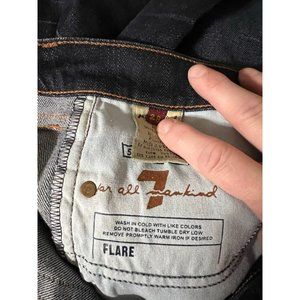 7 For All Mankind women's "Flare" jeans in size 28. Five pocket styling, low-rise, dark blue color. Buttons & zips in the front. The fabric is a blend of 98% cotton, 2% spandex. Please use the measurements below to ensure fit.