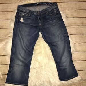 Great, preloved condition. 7 For All Mankind Crop Josefina Skinny Boyfriend. Medium wash with factory distressing. Typical signs of wear. 98% cotton, 2% spandex.