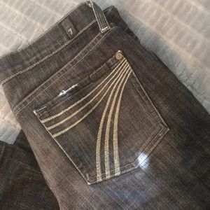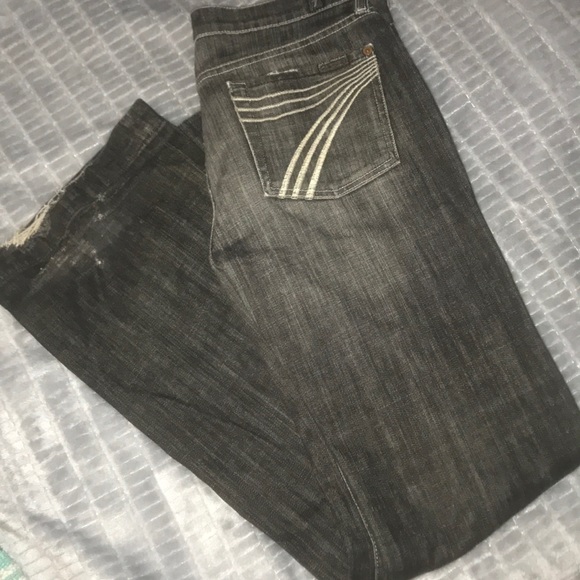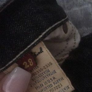 Size 28, frayed on the ends (pictured), everything else is in good condition on them.