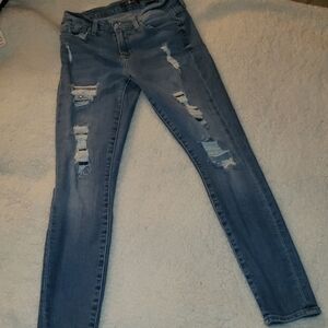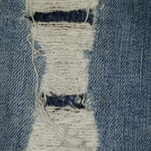 7 For All Mankind destroyed denim jeans with silvertone sequin patchwork underneath the desctuction.